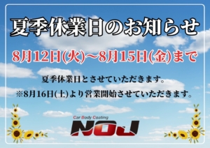この度8月12日~15日は、誠に勝手ながら夏季休業日とさせて頂いております。ご不便をお掛けしますが、休業後も精一杯会員様の愛車のサポートさせて頂きますので、ご理解の程宜しくお願い致します。