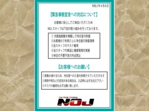 いつもお世話になっております、NOJです! 昨日、発令されました『緊急事態宣言』におきまして、 NOJではいくつかの対処をさせて頂きます。 < 期間 > 令和2年 4月8日 ~ 令和2年 5月6日 まで ① 待合室での密集を回避する為に、メンテナ...